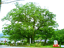 樹齢1000年以上、幹周り11mを超えるこの大木は、アスファルトの道路から気軽に入れる位