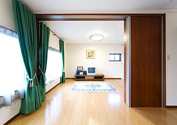 3室に分かれていた部屋を広く使いたいということで、可動間仕切りを使用、普段は広々とした空間で使われるそうです。 土壁を落とし、下地に構造用合板を使った耐震補強もしました。 床は、竹調のフローリングを使用しています。